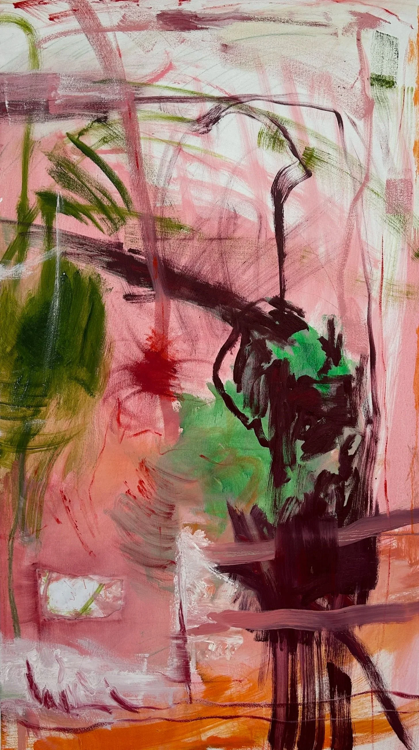 Oil, oil stick, pencil, charcoal and paper on canvas.